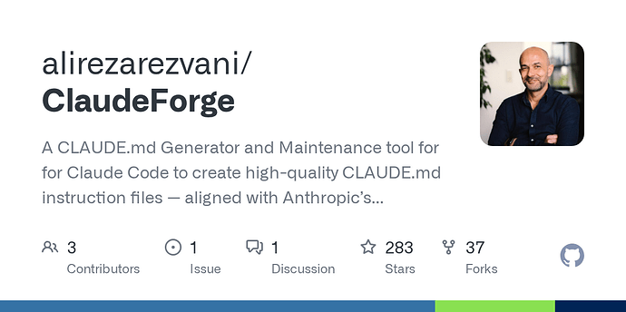 ClaudeForge is an open source toolkit, MIT licensed, created by Alireza Rezvani (CTO of a HealthTech startup in Berlin). Its purpose is to automate the creation, analysis, and maintenance of CLAUDE.md files.