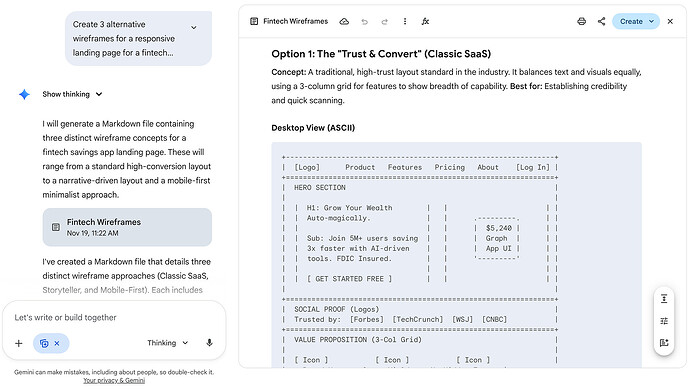 Cuando envío el prompt, Gemini agrega la salida directamente al lienzo. Si haces clic en Abrir, verás la salida proporcionada por la IA. Nota rápida: Uso formato ASCII para wireframes en lugar de bocetos visuales porque facilita compartir el diseño. Básicamente es texto plano formateado usando símbolos de texto básicos.