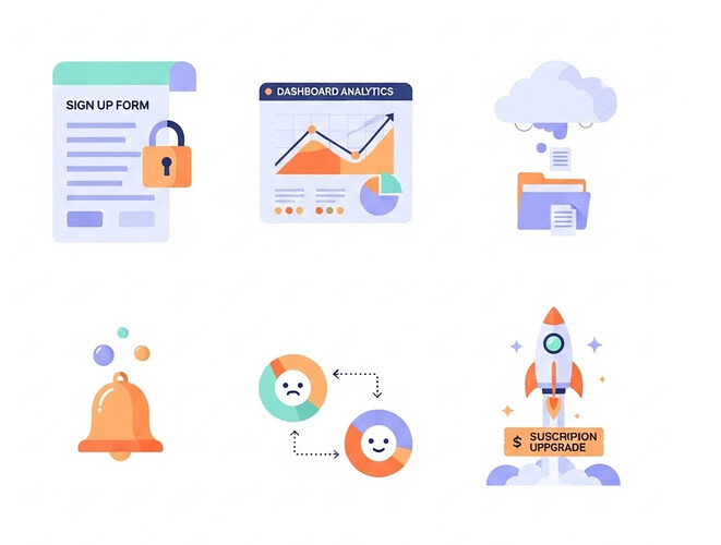Crea 6 ilustraciones en estilo consistente para un flujo de incorporación de sitio web. Estilo: plano y minimalista, paleta de colores suaves, formas redondeadas. Temas: registro, análisis de panel, importación de datos, notificaciones, colaboración, actualización de suscripción.