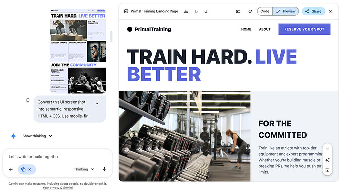 No es una traducción uno a uno del diseño, pero está bastante cerca. Y lo mejor es que Gemini genera el código fuente, por lo que puedes cambiar a la pestaña Código y copiar/ajustar el código fácilmente.