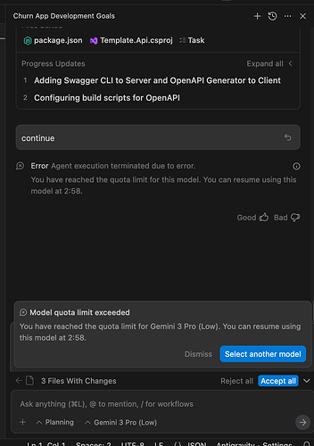 Oh, está bien. No hay botón para reintentar el prompt. Supongo que puede equivocarse una vez y simplemente seguir adelante. Y luego, nuevamente, el agente termina debido a un error. Escribo “continuar”. Da un par de patadas a la pelota y vuelve a fallar. Escribo continuar. Luego, Gemini 3 empieza a mentir sobre Angular.